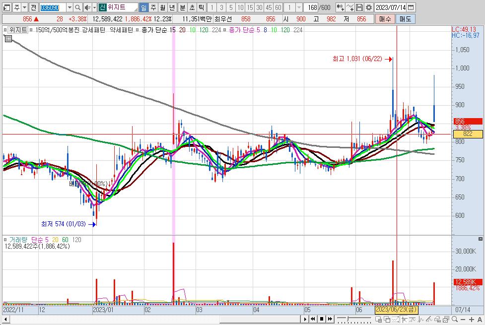 위지트는 자회사 티사이언티픽이 국내 가상자산 거래소 빗썸을 운영하고 있는 빗썸홀딩스와 빗썸코리아 지분을 일부 보유한 걸로 알려지면서 관련주로 분류됐다.