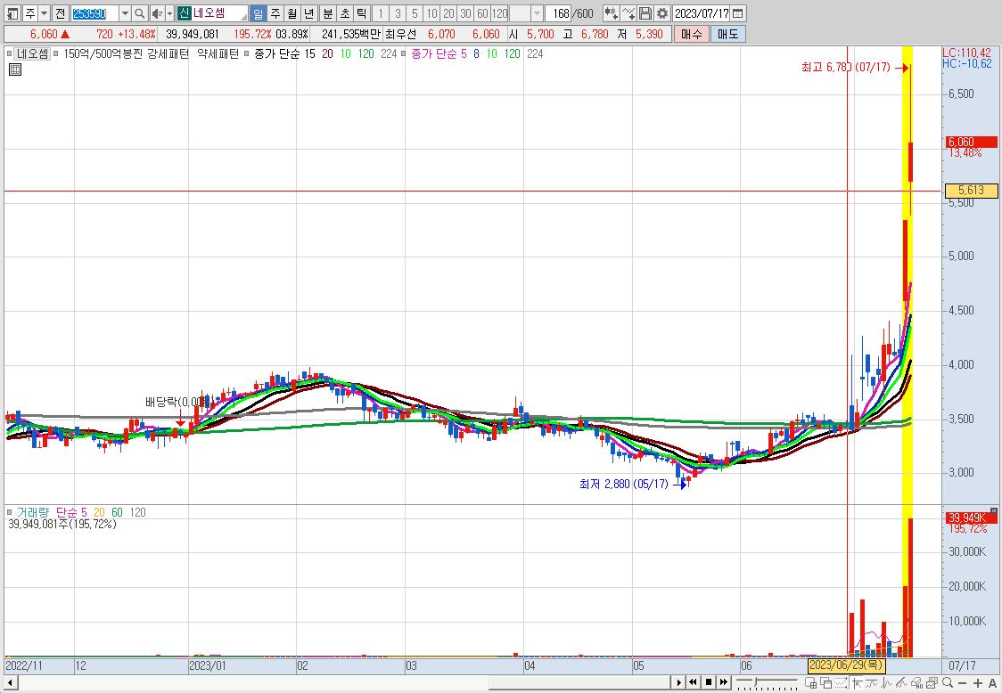 네이버가 오는 8월 24일 차세대 초거대 AI '하이퍼클로바X'를 공개한다는 소식에 영향을 받는 것으로 보인다.
